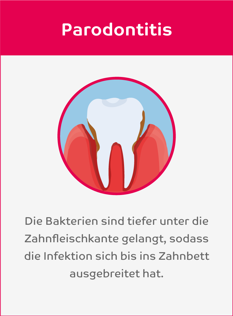 Der Parodontitis geht eine länger bestehende Zahnfleischentzündung voraus. Die entzündungsauslösenden Bakterien wandern vom Zahnfleisch bis ins Zahnbett ein und lösen dort die Infektion aus.